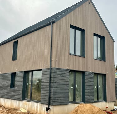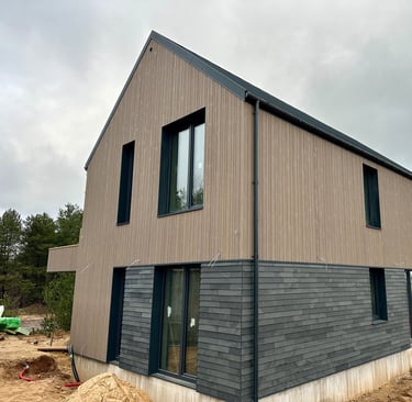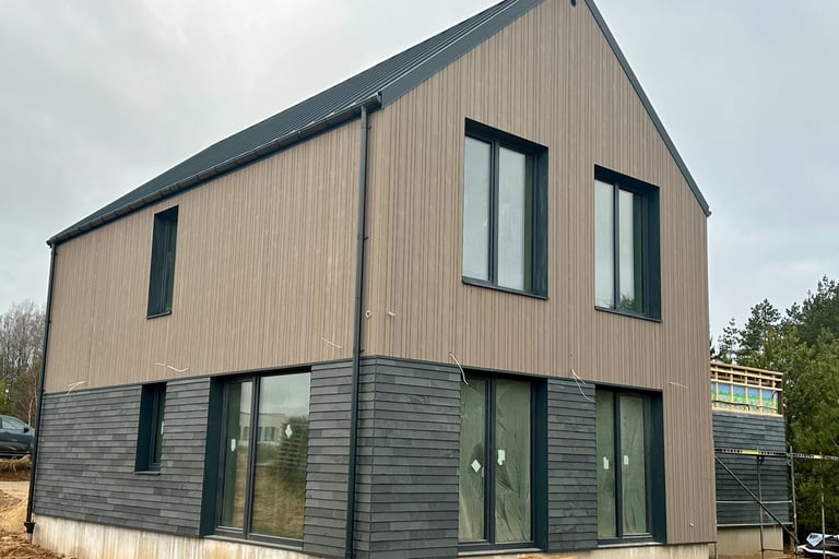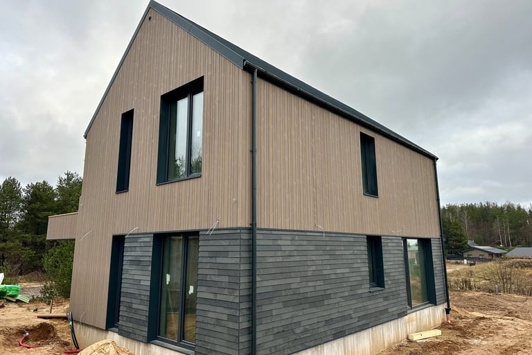 Išorės eksterjeras: Degintos medienos dailylentės, skalūnas