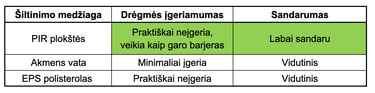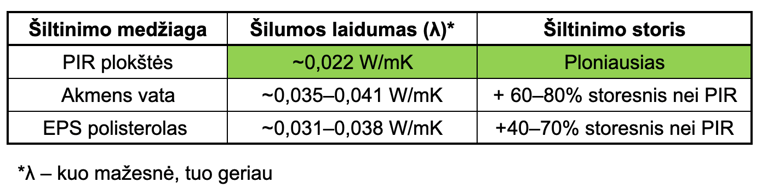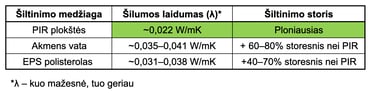 Išvada: PIR plokštės beveik 2x efeltyvesnės už akmens vatą ir EPS polisterolą.