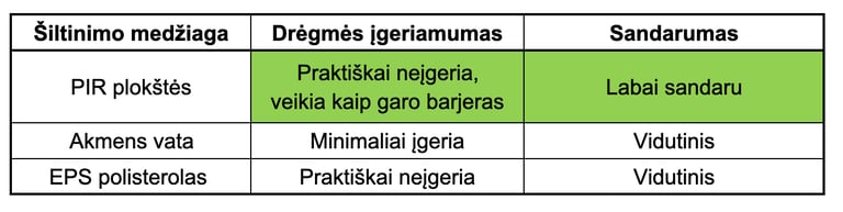 Išvada: PIR plokštės turi mažiausias drėgmės įgeriamumo ir geriausias sandarumo savybes