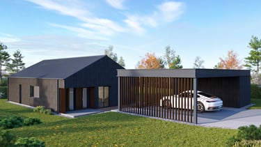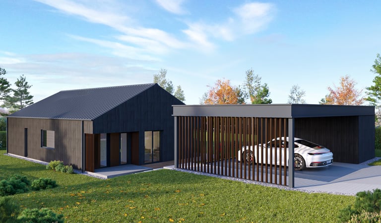 Papildomai: Erdvi terasa, 2 automobilių stoginė, sandėliukas