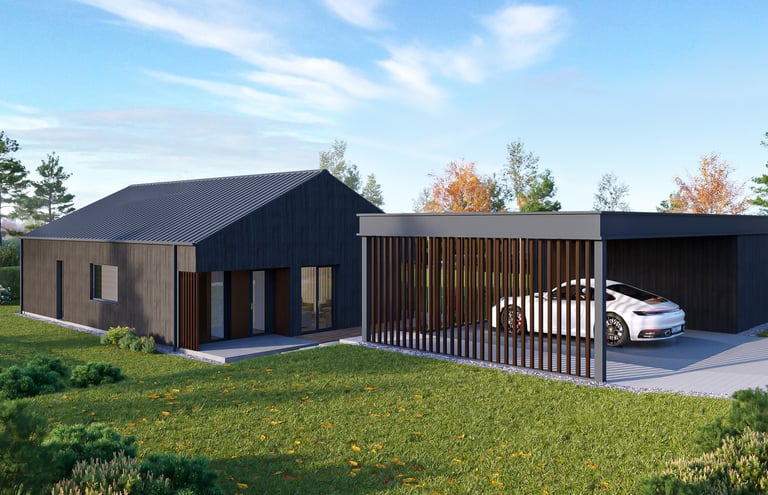 Papildomai: 2 automobilių stoginė, sandėliukas